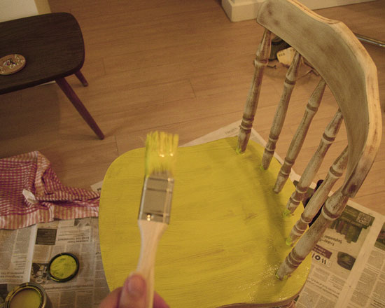 I’m very partial to vile colours.  I immediately pictured the boring wooden chairs in the ultimate ‘so wrong, it’s right’ colour — chartreuse. We sanded ’til we could sand no more, then set to work slapping on that delightfully offensive paint colour.