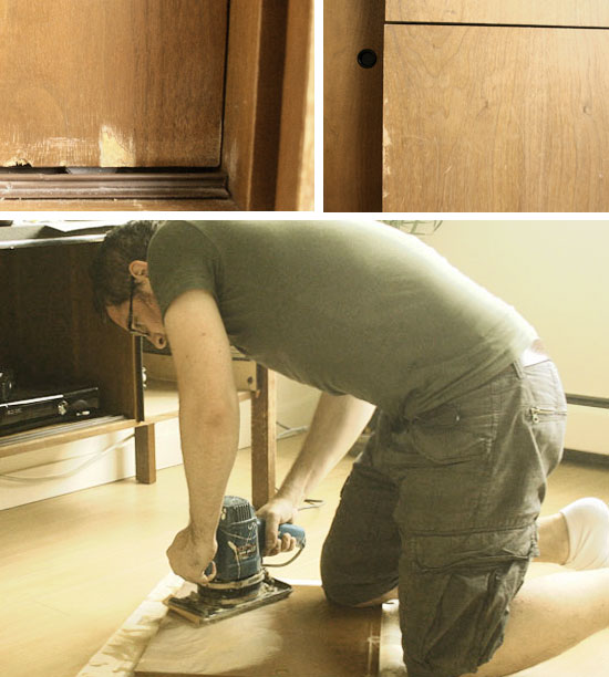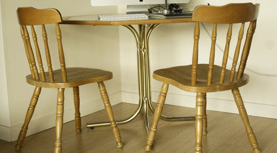 We bought some pretty beat up old furniture from yard sales when we moved into our flat in Vancouver.  It was kind to our empty immigrant pockets, and I like owning things that have a bit of history.  A naff glass top table with wooden chairs, and a credenza from the late ’70s were prime candidates for some rainy Sunday DIY.