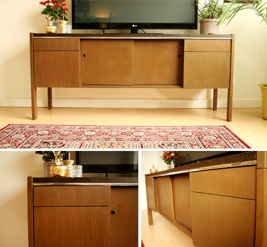 Our credenza was under a pile of other furniture at the end of a tunnel of wood and shoes. We rescued it! Peter sanded it down and we re-varnished it. The colour is richer and it evened out a lot of bruises and imperfections.