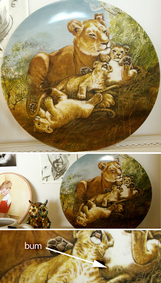 I also had some mild thrifting success myself.  I picked up a decorative plate of a lioness and her cubs. It’s so beautifully detailed that if you look closely, you can see a cub’s, erm, bottom orifice. Charming!