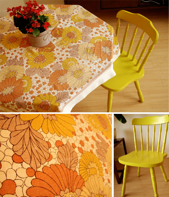 A few layers of paint later and voila! Chairs with (nauseating) impact. I got lazy with the table, and threw a thrifted vintage table cloth over it. I found the material for 3 bucks, and it miraculously fits the weirdly shaped table perfectly.